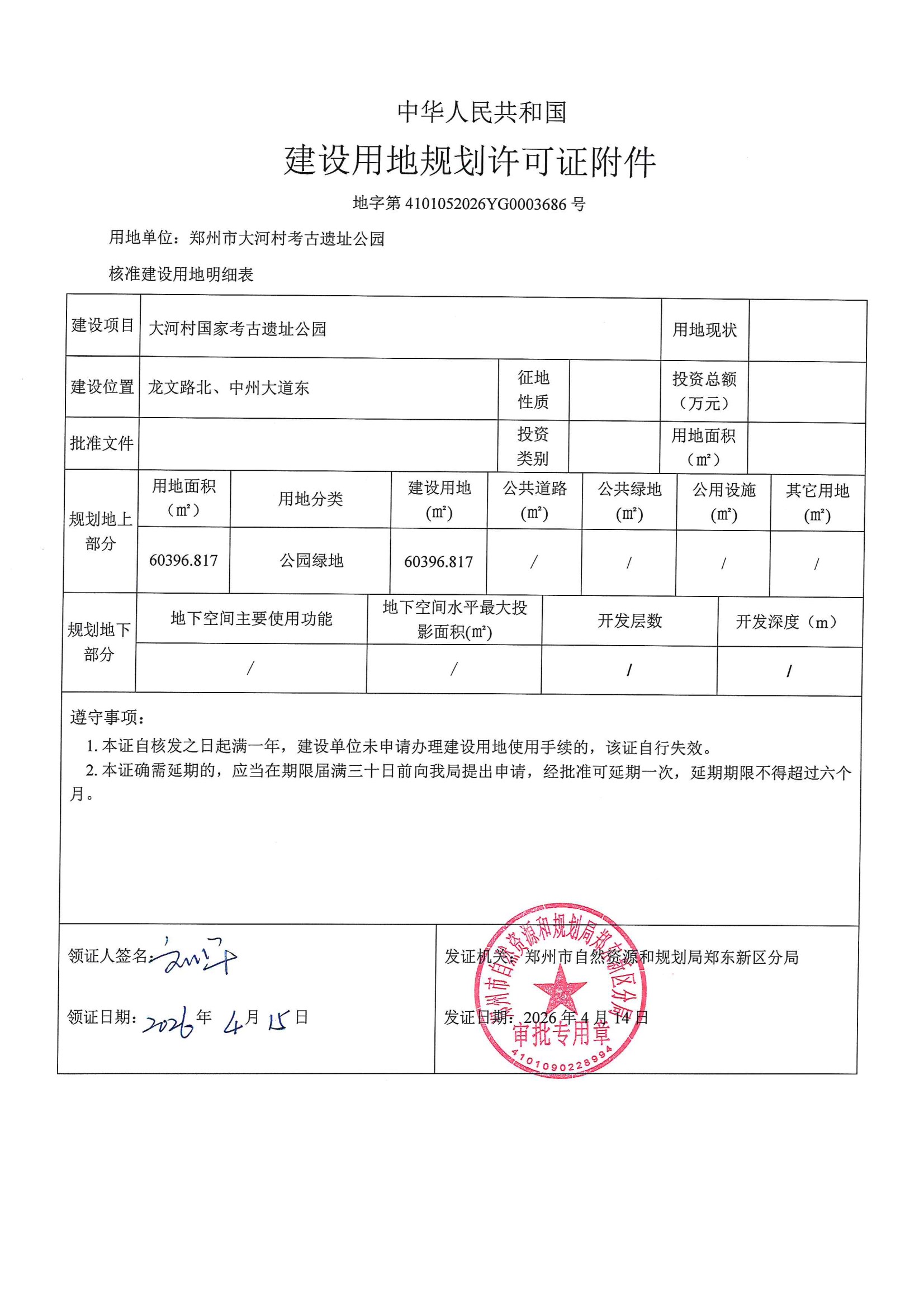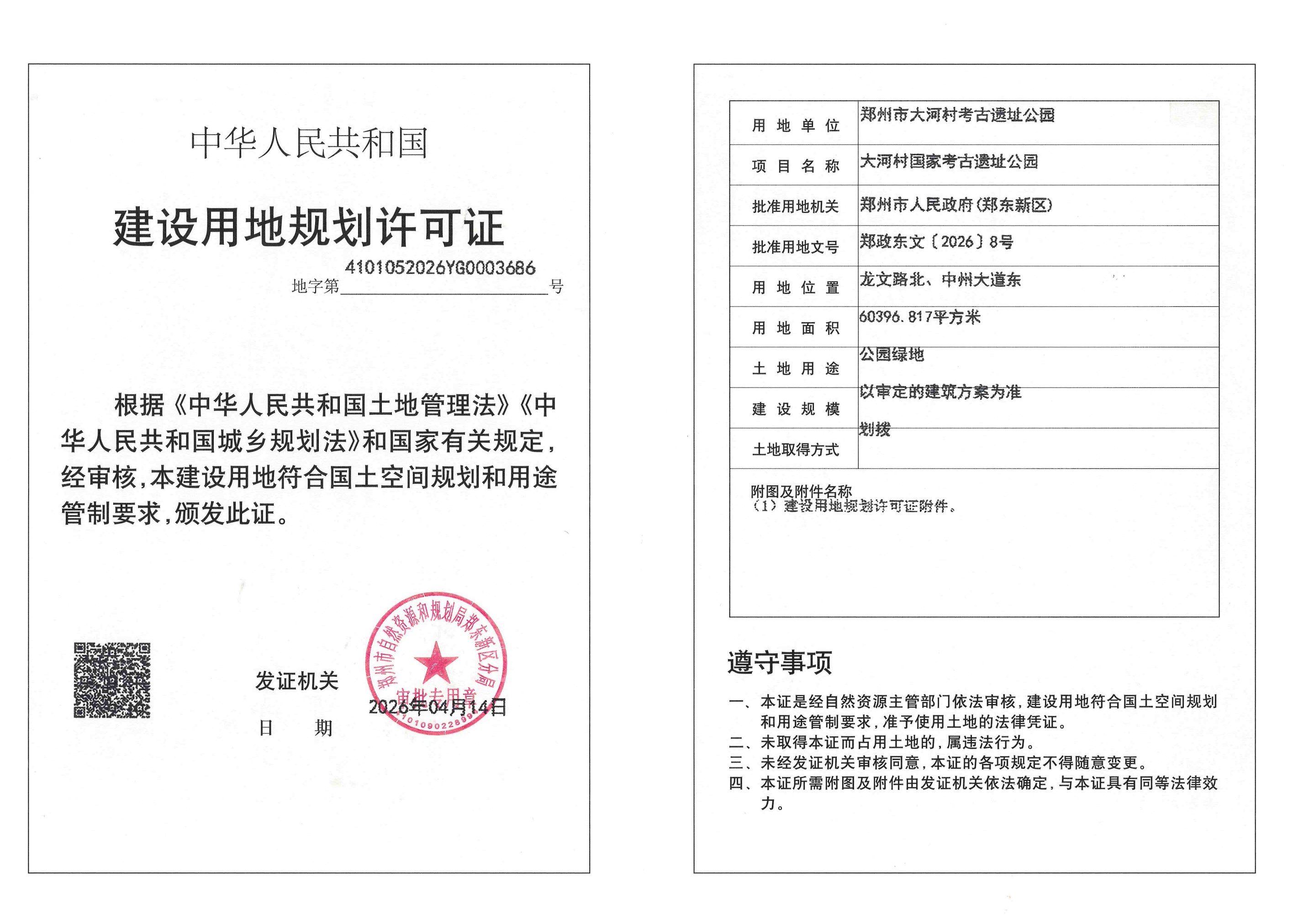 大河村国家考古遗址公园建设用地规划许可证批后公告