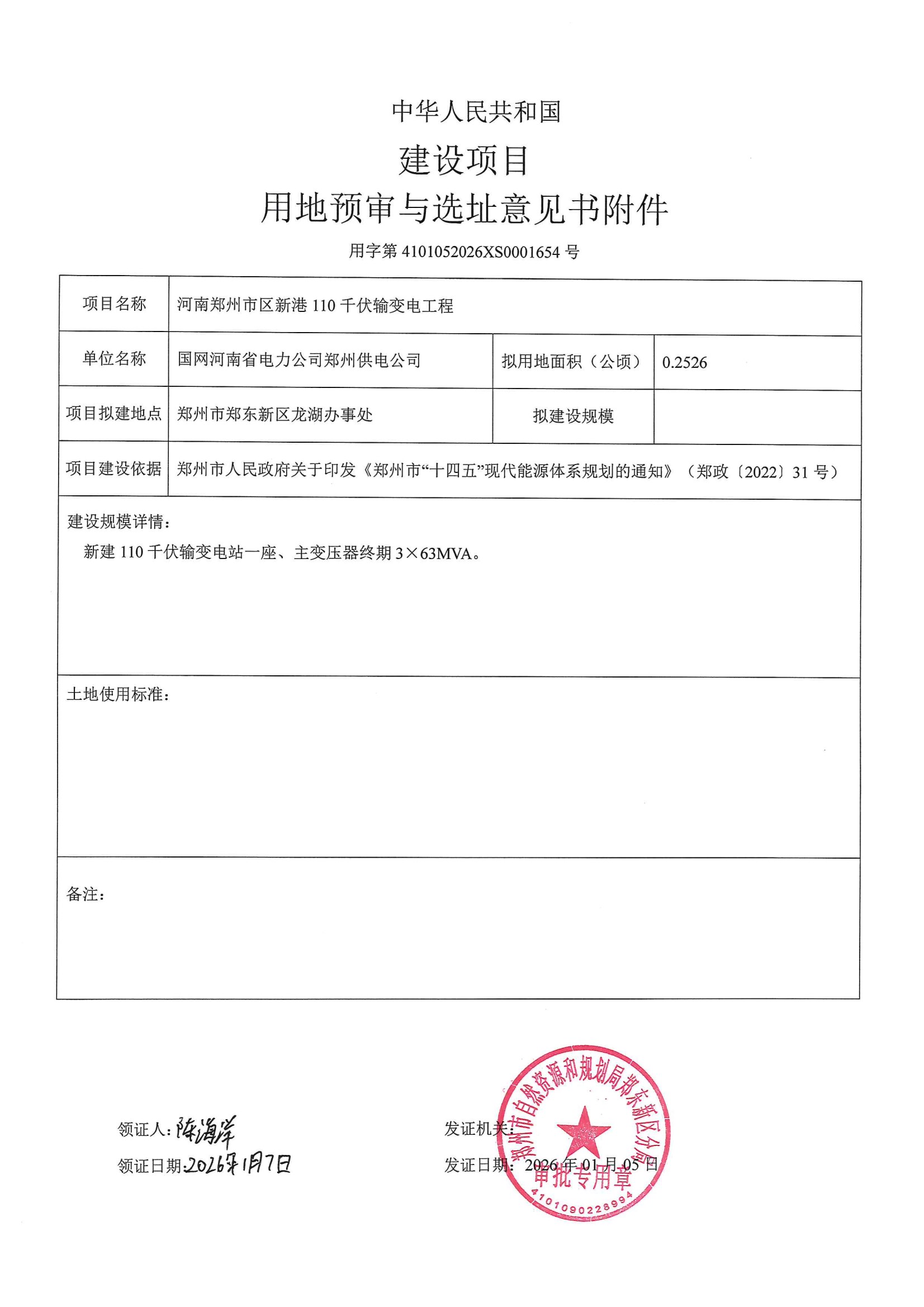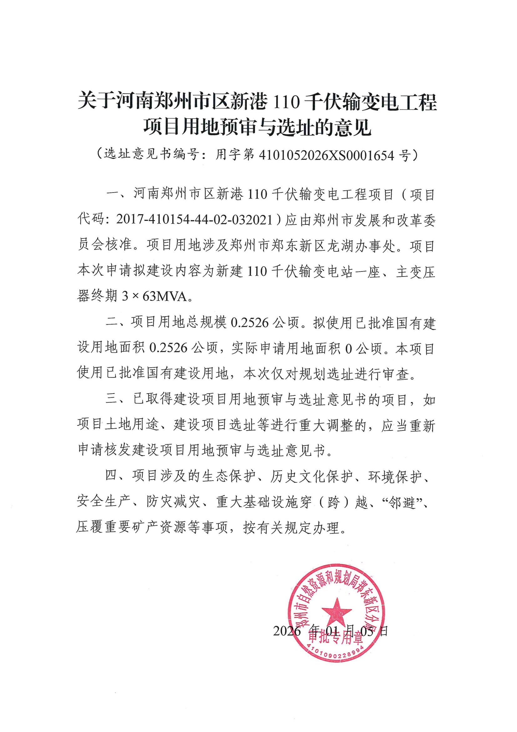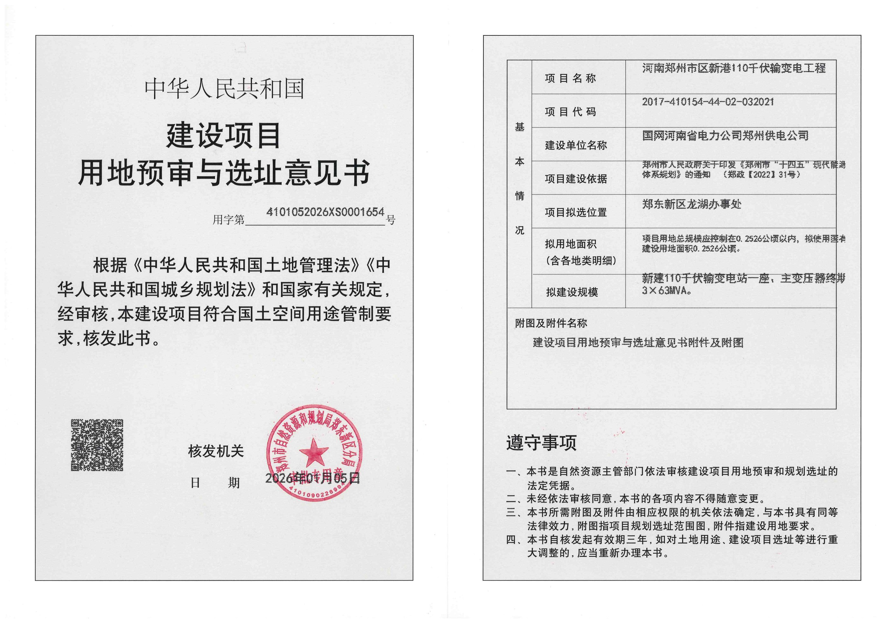 河南郑州市区新港110千伏输变电工程建设项目用地预审与选址意见书
