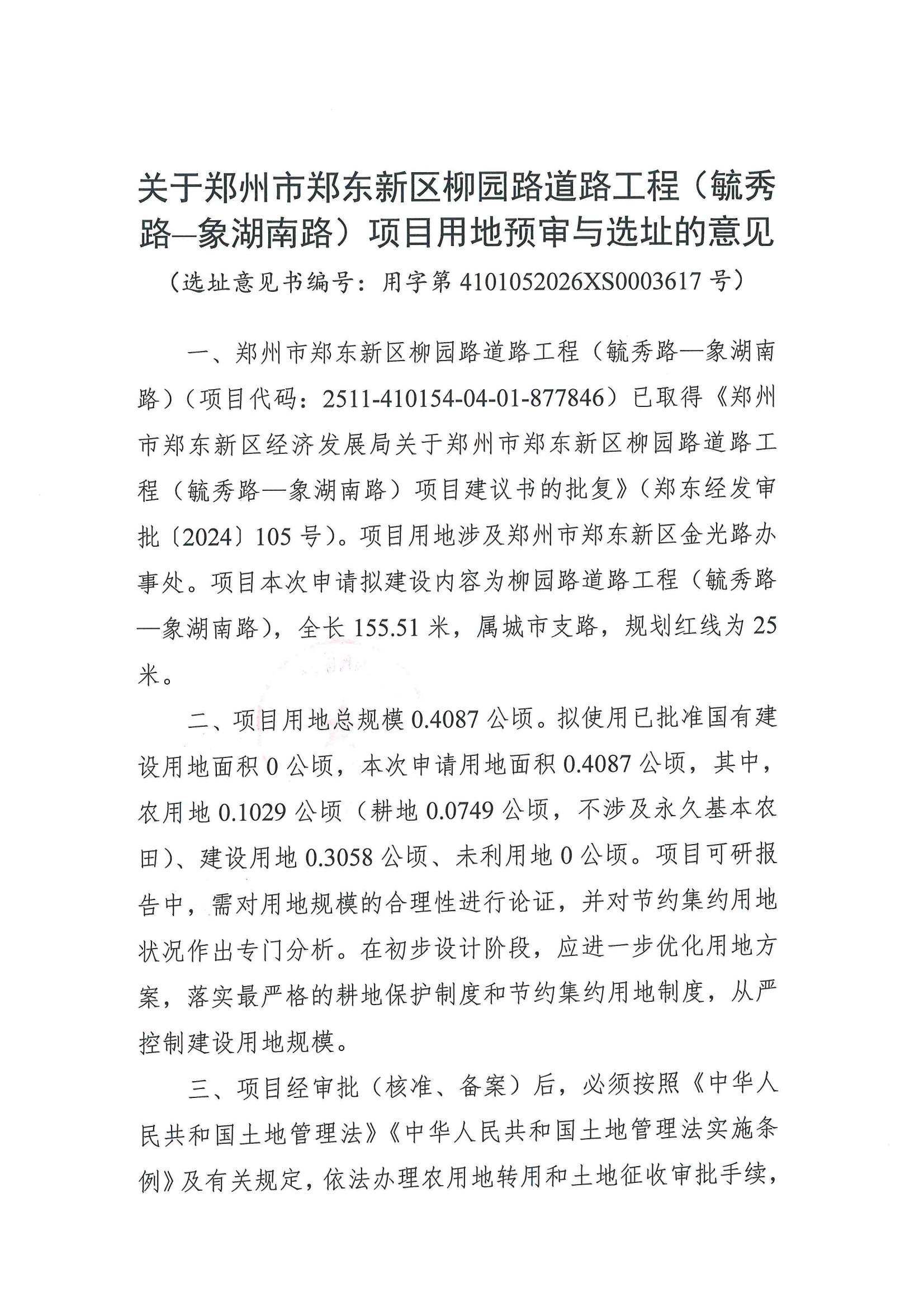 郑州市郑东新区柳园路道路工程(毓秀路-象湖南路)建设项目用地预审与选址意见书