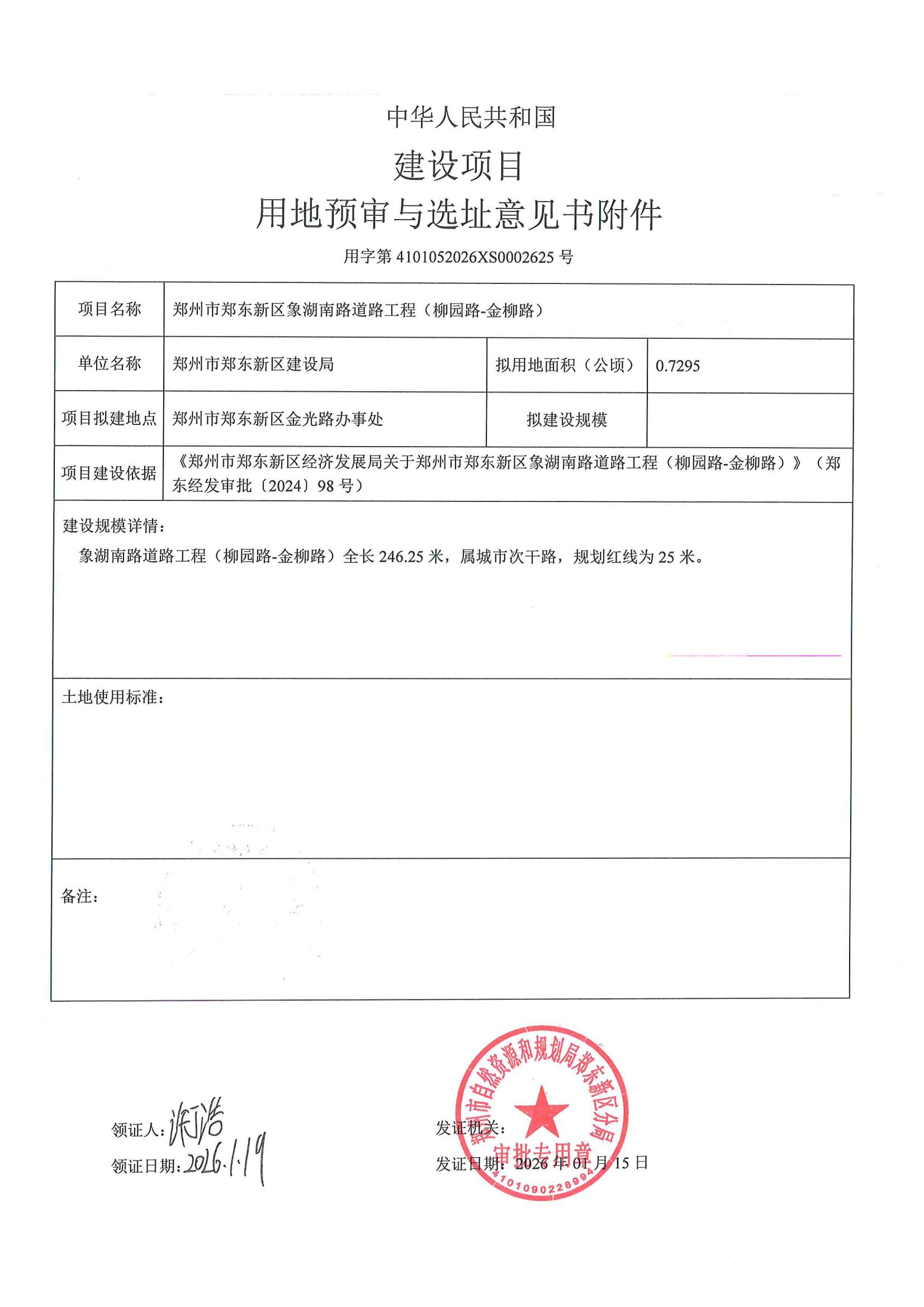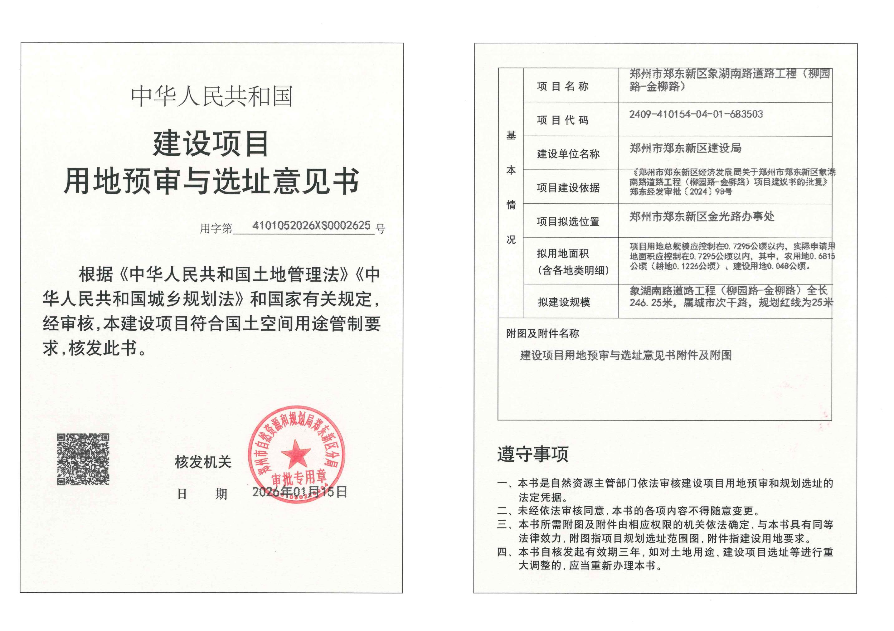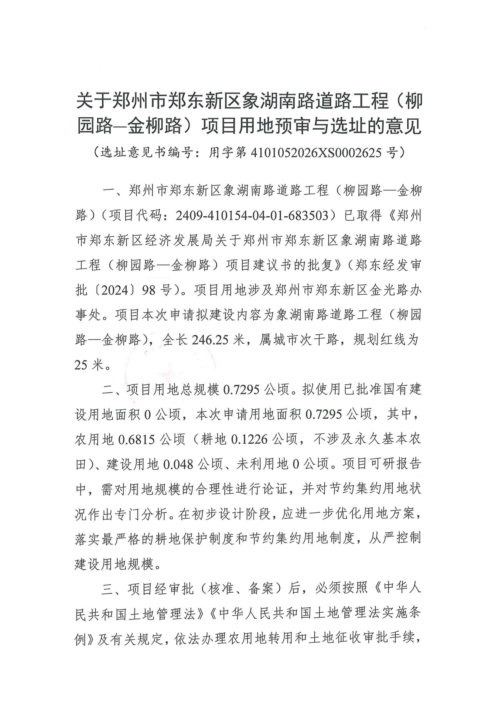 郑州市郑东新区象湖南路道路工程(柳园路-金柳路)建设项目用地预审与选址意见书
