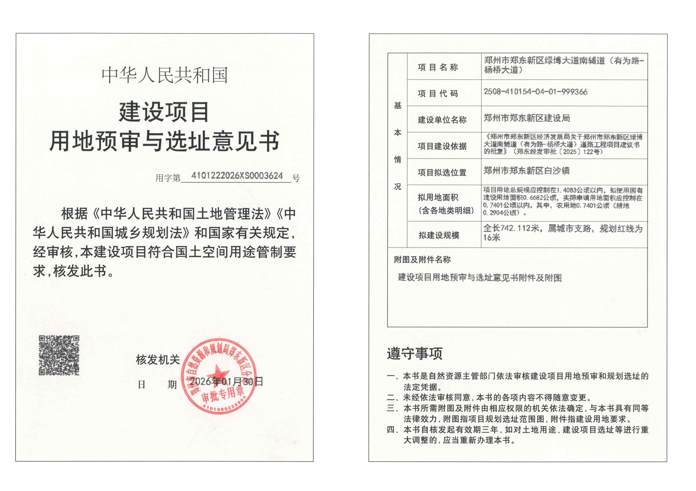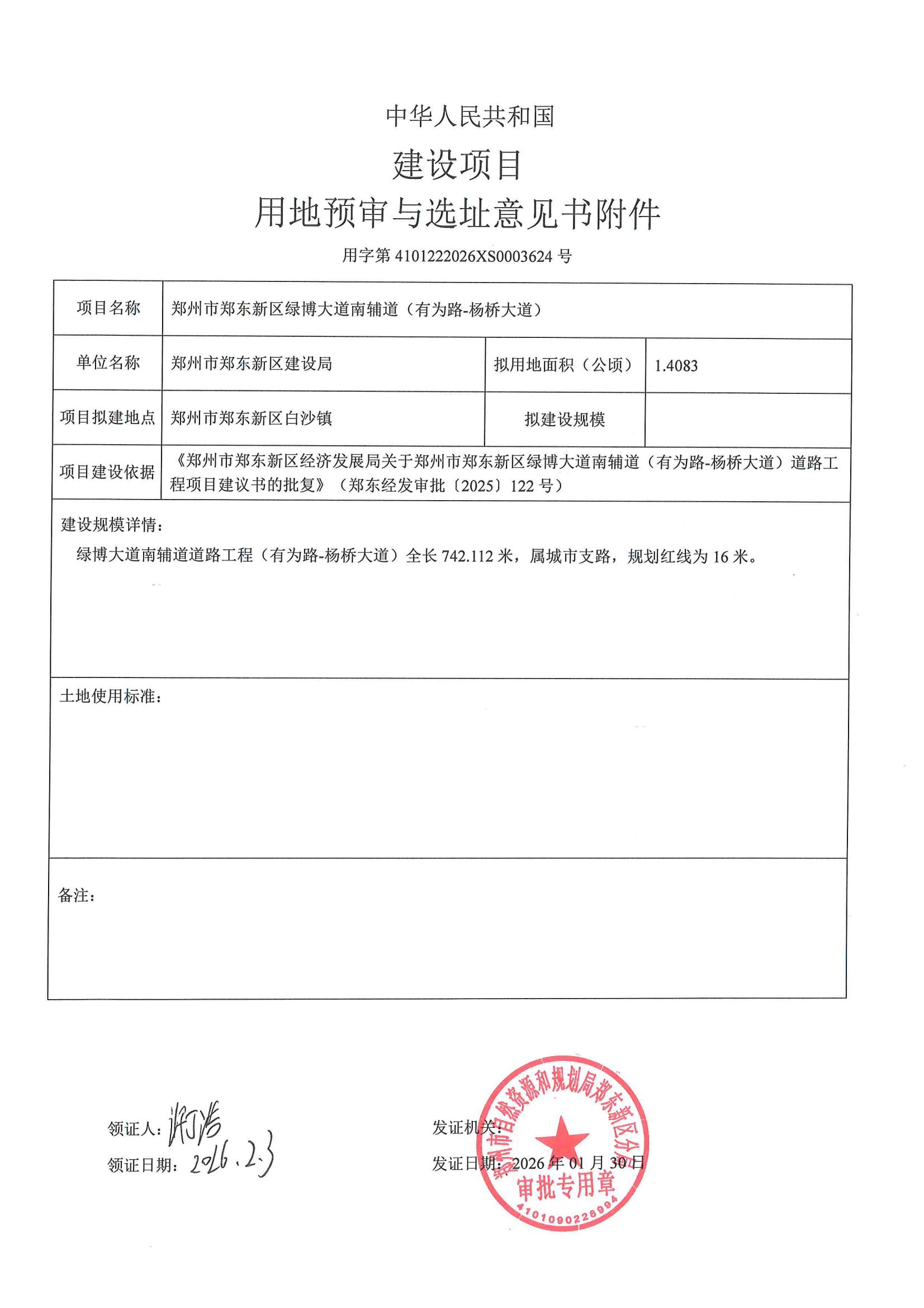 郑州市郑东新区绿博大道南辅道(有为路-杨桥大道)建设项目用地预审与选址意见书