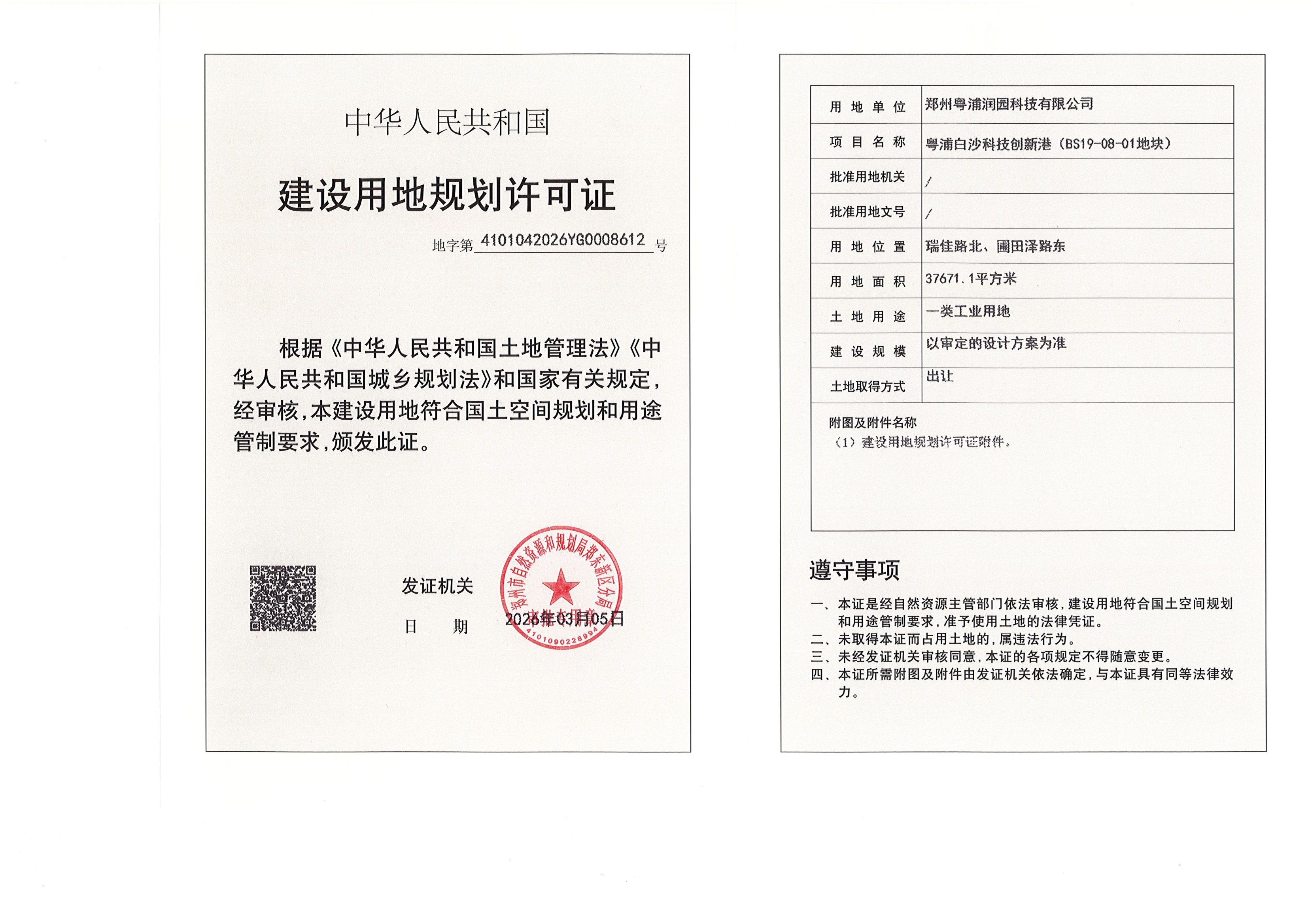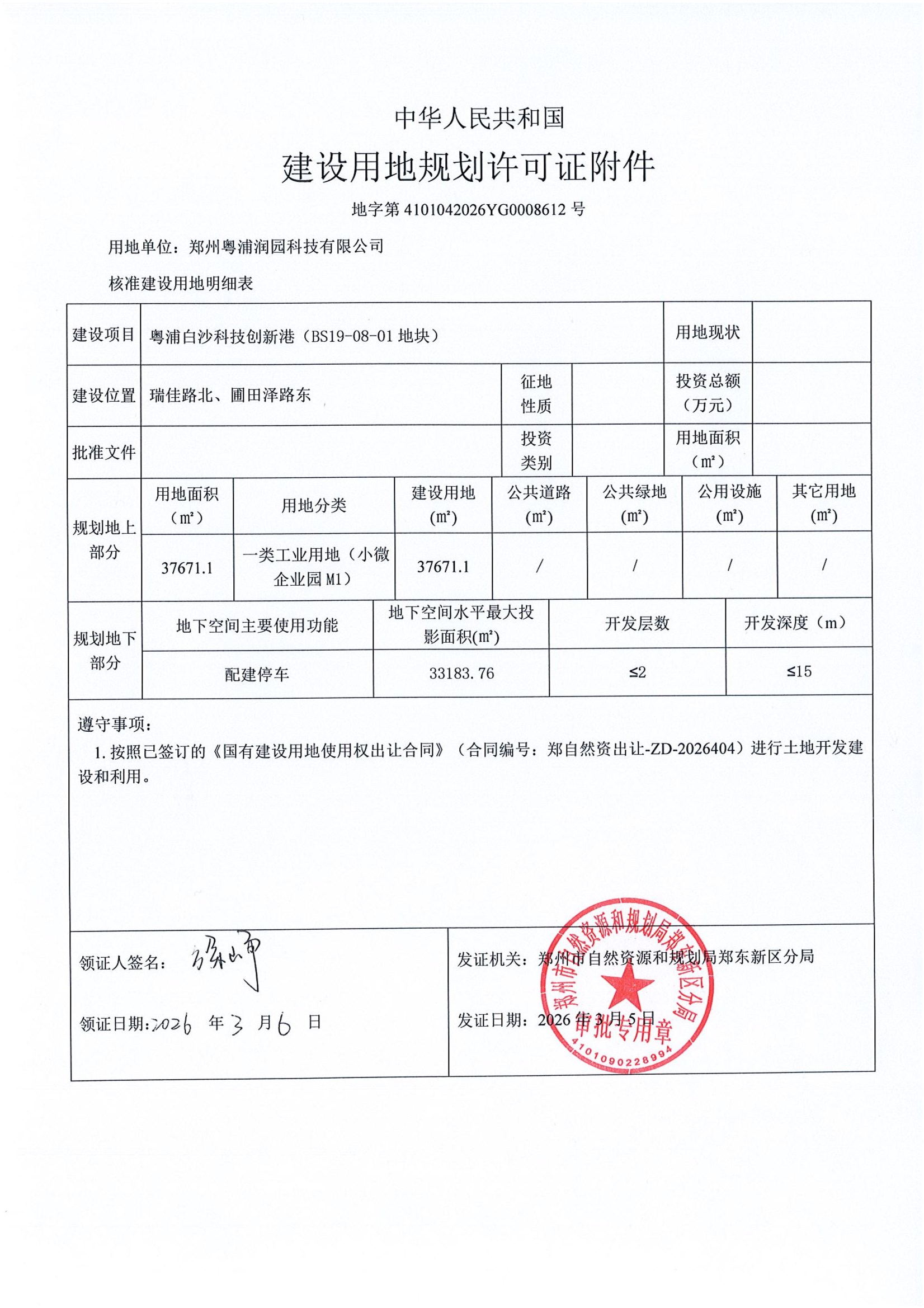 粤浦白沙科技创新港(BS19-08-01地块)建设用地规划许可证批后公告