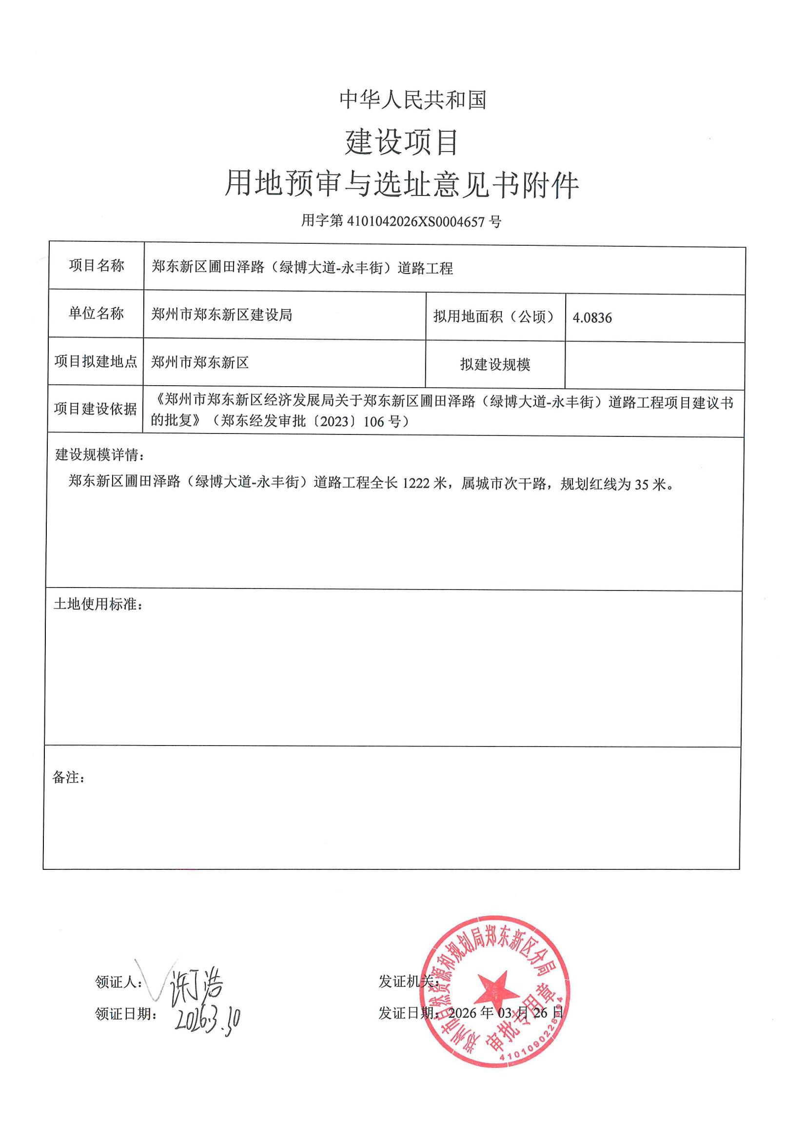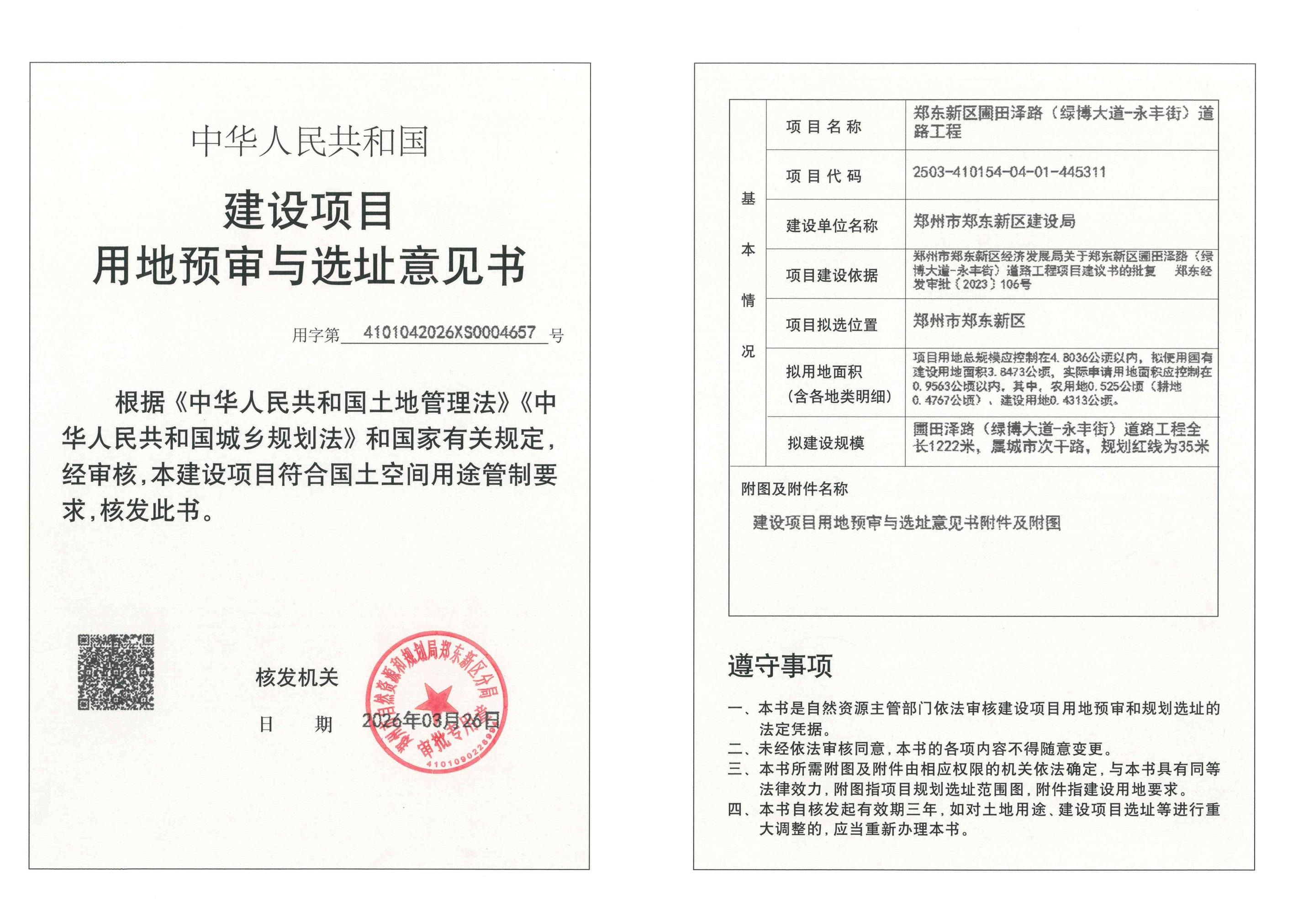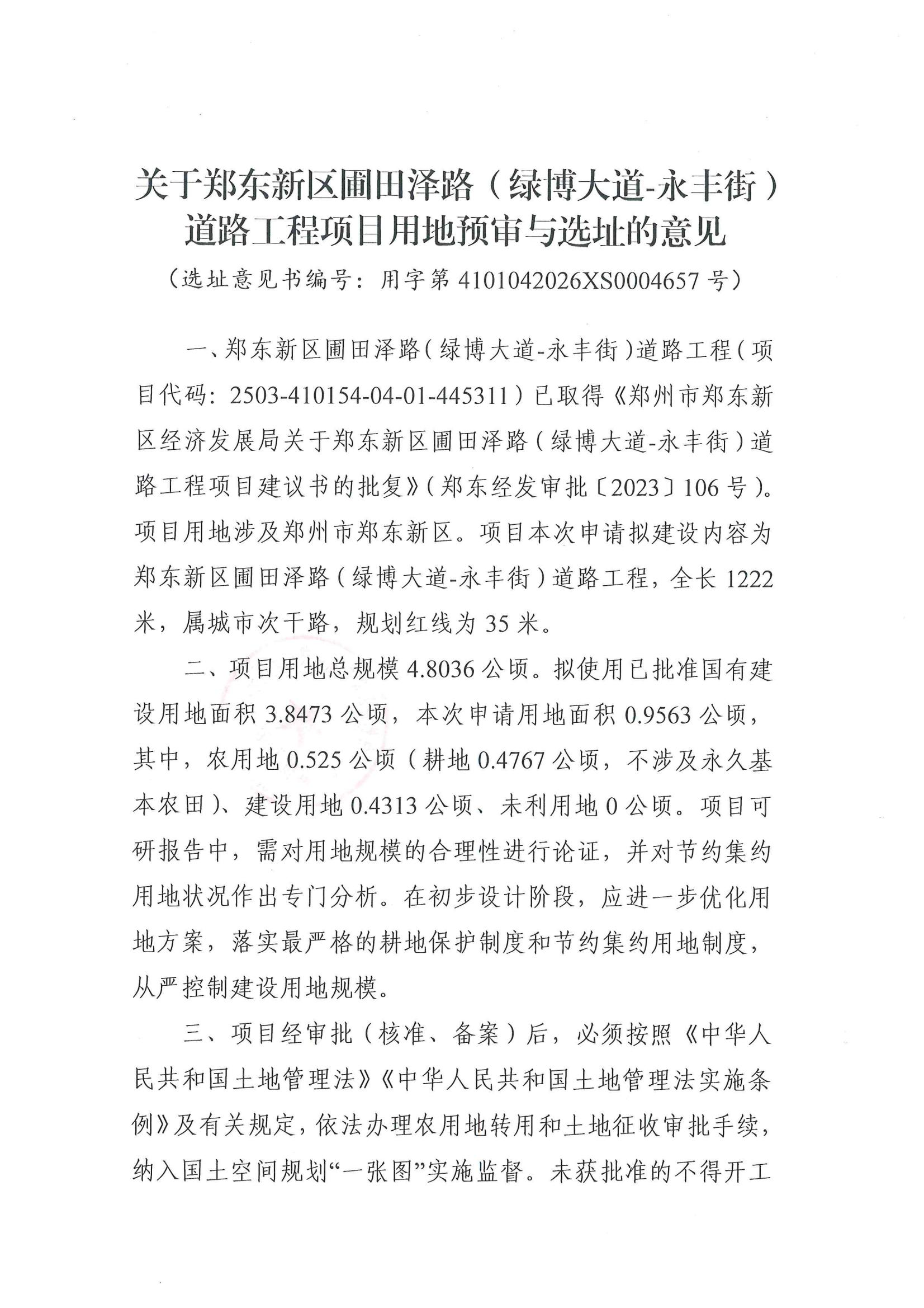 郑东新区圃田泽路(绿博大道-永丰街)道路工程建设项目用地预审与选址意见书